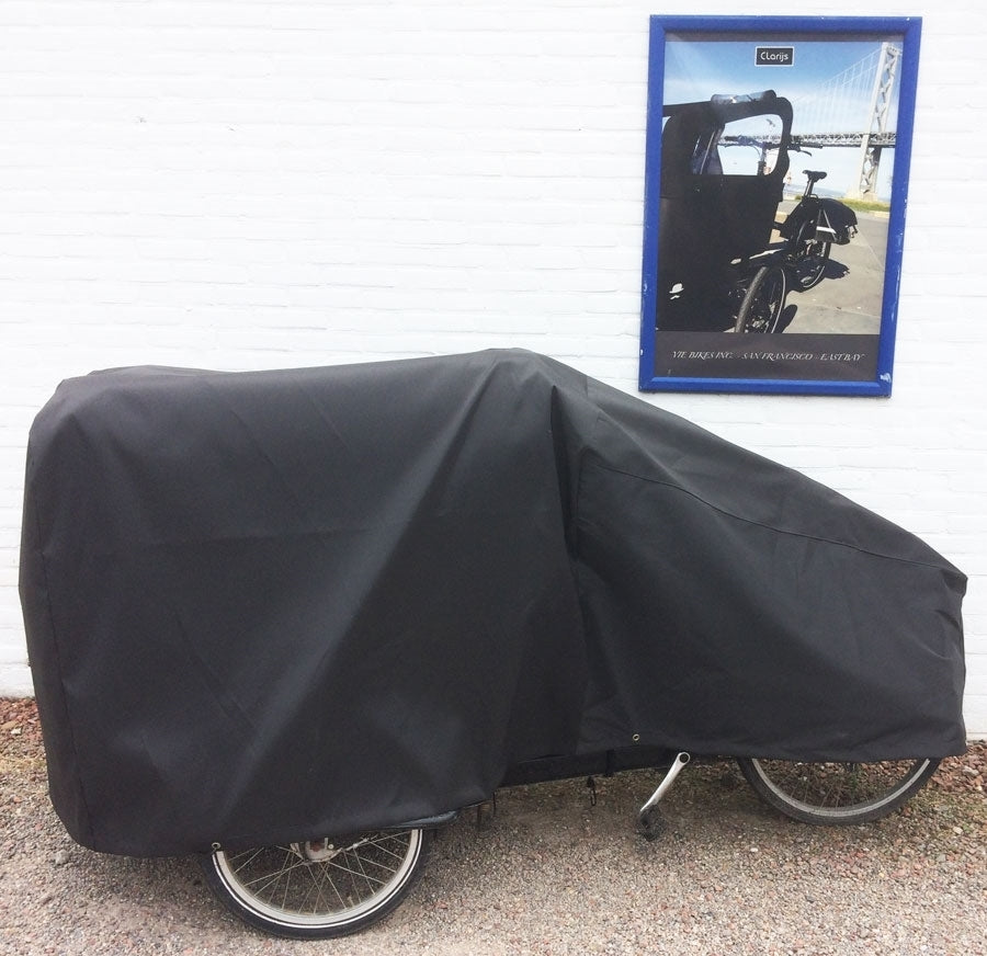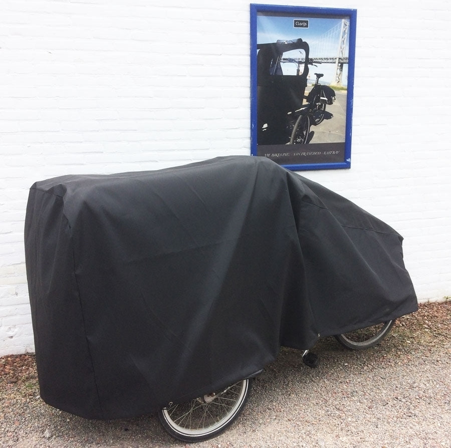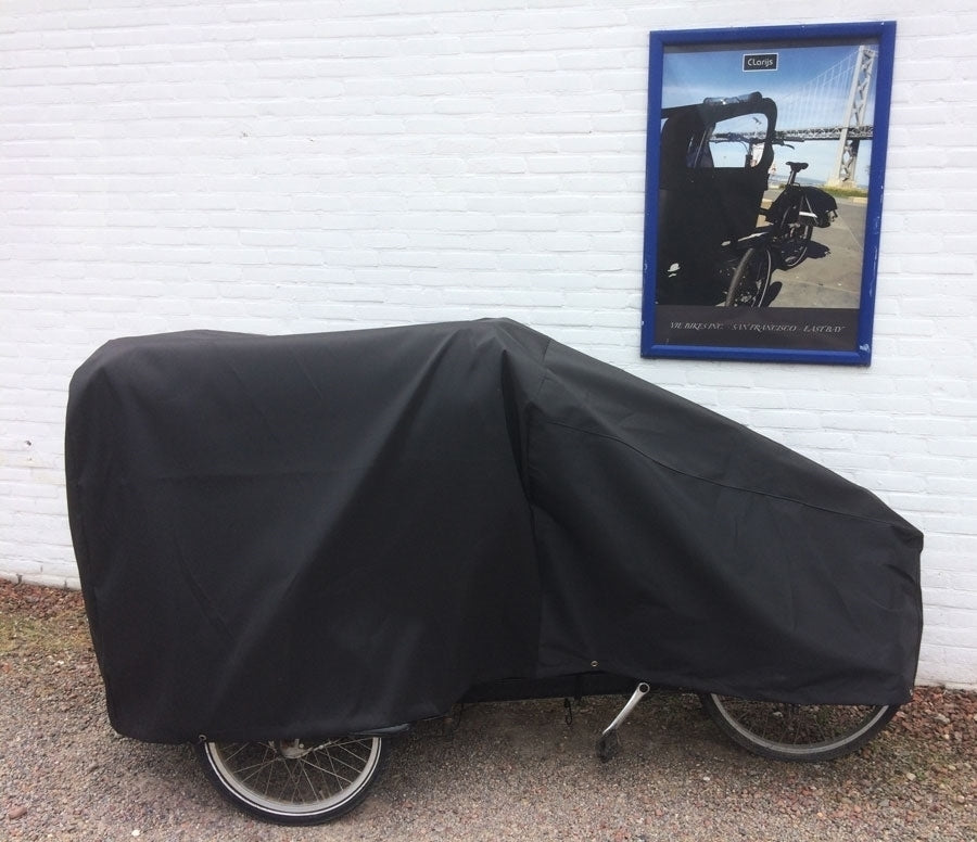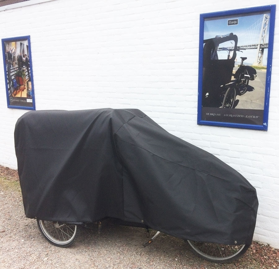 De Bakfiets regenhoes driewieler Clarijs is een waterdichte en duurzame hoes, gemaakt van sterk geweven nylon met PU-coating. Het elastiek en de stevige metalen ringen zorgen voor een goede bevestiging en extra diefstalbescherming.